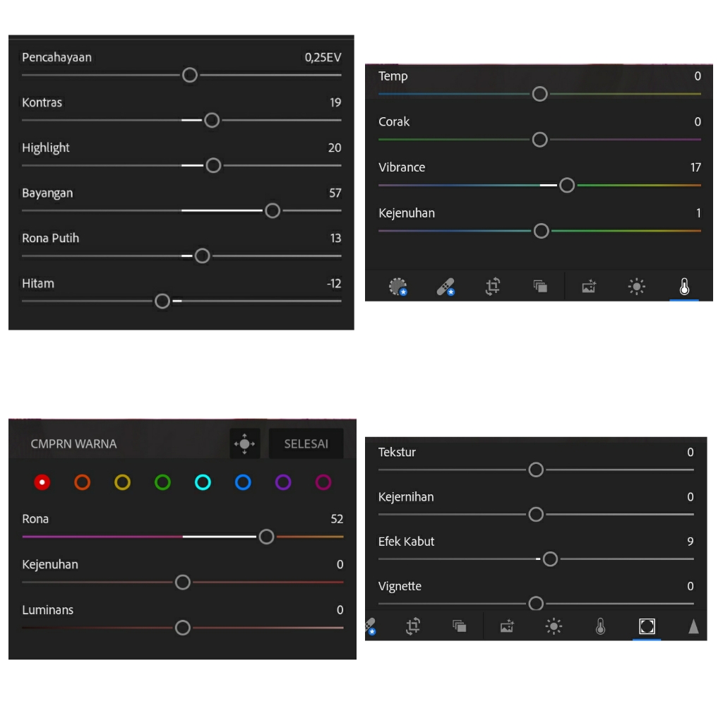 Nah lightroom ini yang jadi kunci keberhasilan editing di HP. Untuk menghasilkan foto yang bagus maka dibutuhkan settingan yang pas dan tidak berlebihan baik komposisi warna maupun lightning nya.