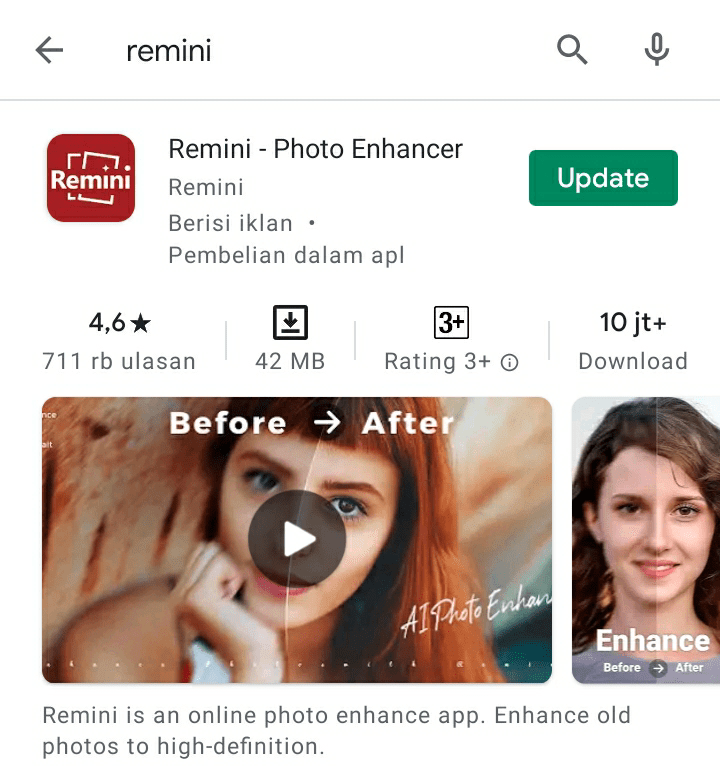 Setelah itu saya menggunakan aplikasi remini. Kalian bisa mendownloadnya di playstore ya gais.