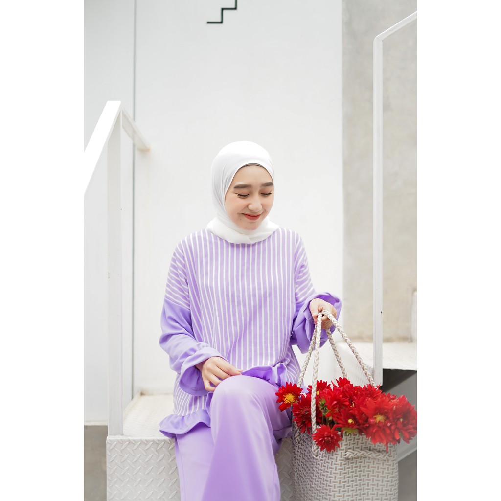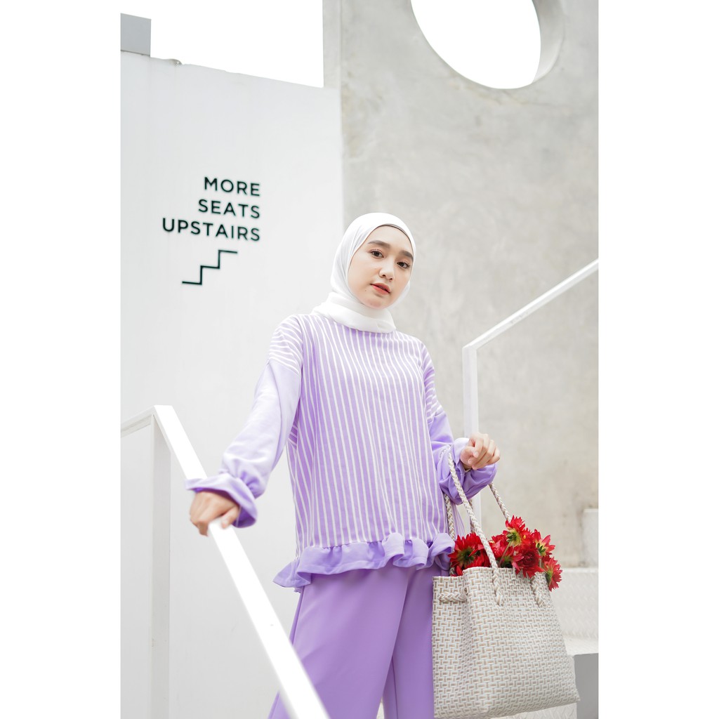 Alasan kenapa aku merekomendasikan produk ini karena model nya yang nggak pasaran alias diproduksi ekslusif oleh Mybamus. Dengan memadukan motif stripe dengan warna polos lilac ditambah aksen ruffle di bagian bawah, dan juga ujung lengan kerut. Pastinya bikin penasaran pengen nyoba 😍. Yuk langsung saja borong DISINI.